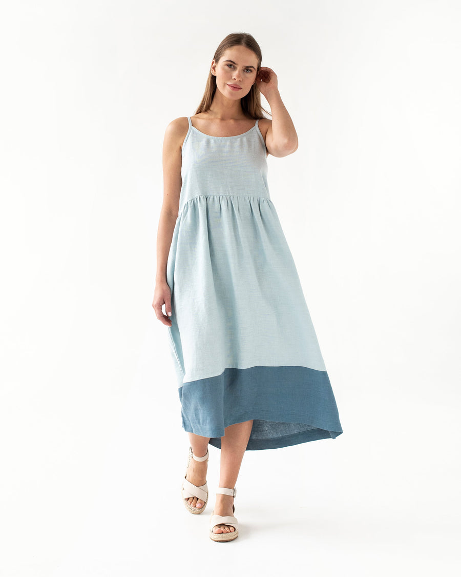 Bräunungsfreundlich. Unser Colorblock-Leinenkleid mit Spaghettiträgern CETARA in Altblau und Graublau lässt Ihre frisch erworbene Sommerbräune perfekt zur Geltung kommen. Weiße Kleider sehen auf gebräunter Haut einfach perfekt aus. Um dieses Kleid noch interessanter zu machen, haben wir Farbblöcke am Saum und an der gerafften Taille hinzugefügt – es sieht nicht nur am Strand toll aus, sondern ist auch ein Hingucker auf Sommerpartys.