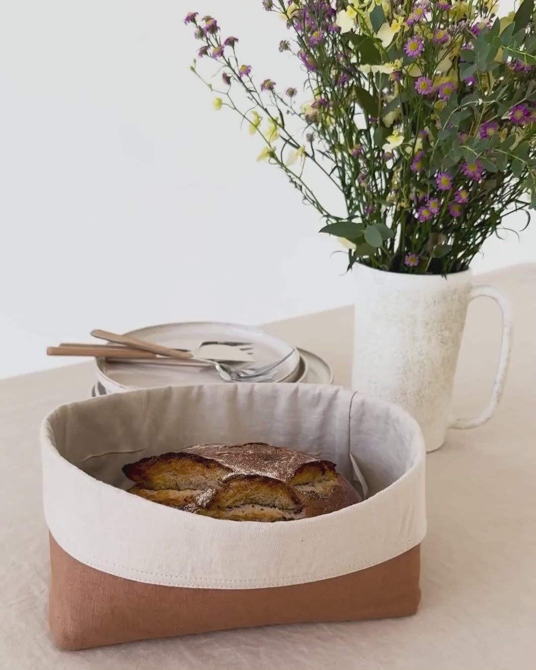 Bewahren Sie Ihr frisch gebackenes Brot in einem Brotkorb aus Zimtleinen auf. Perfekt, um Ihrem Tisch Wärme und Charme zu verleihen. Der atmungsaktive Stoff bewahrt die Frische und verleiht Ihrer Küche einen Hauch schlichter Eleganz. Ideal zum stilvollen Servieren von Brot, Brötchen oder Gebäck.