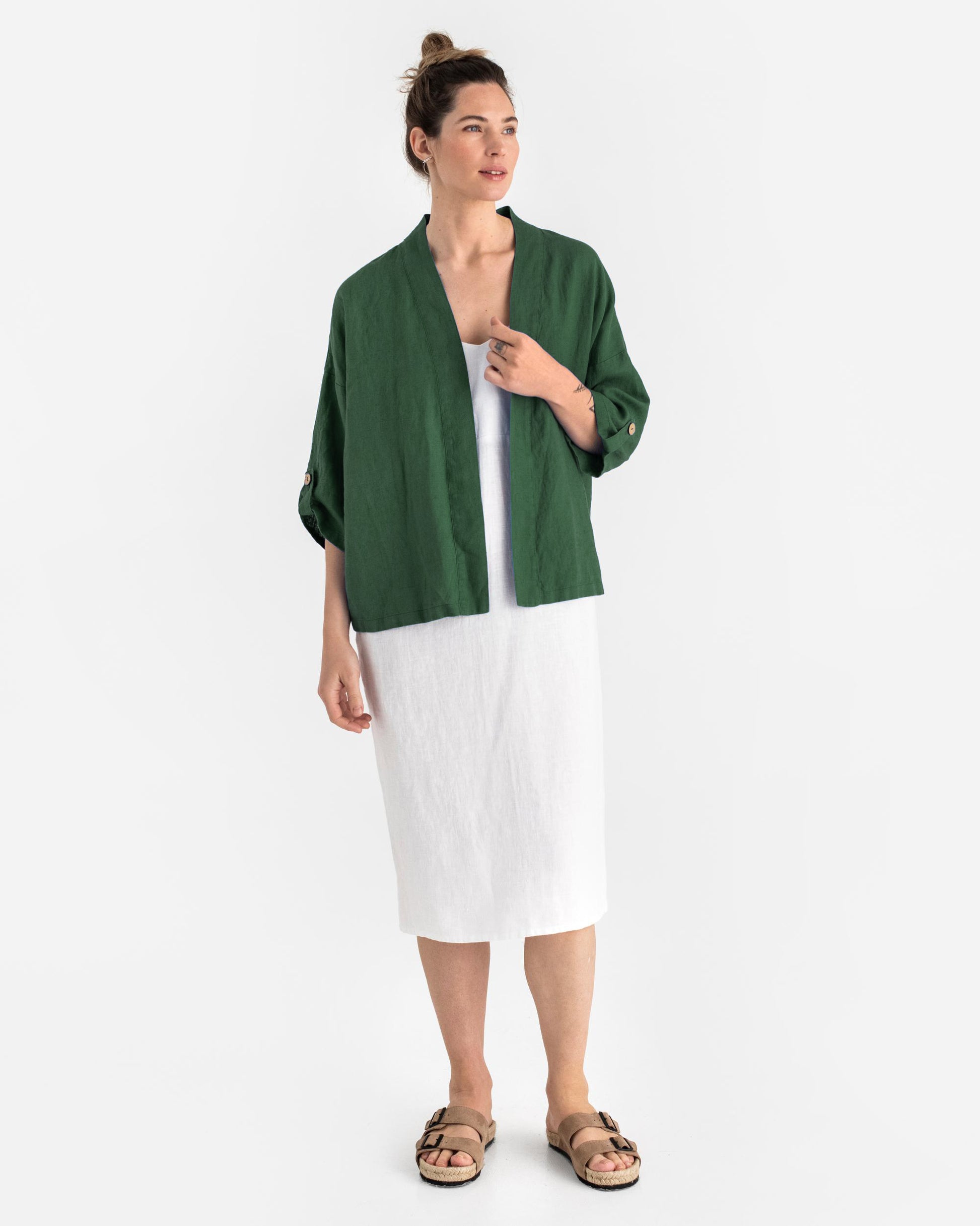 Der Die schwarze Leinen-Kimonojacke von BANOS ist ein elegantes und zugleich müheloses Kleidungsstück für den Lagenlook, das für Vielseitigkeit und Komfort konzipiert ist. Diese leichte Jacke aus 100 % natürlichem Leinen besticht durch ihr entspanntes, offenes Design mit weiten Ärmeln und verstellbaren, geknöpften Manschetten und bietet eine Mischung aus Eleganz und Leichtigkeit. Dank ihres atmungsaktiven Materials ist sie ideal für alle Jahreszeiten, ob über einem lässigen Outfit getragen oder mit maßgeschneiderten Kleidungsstücken für einen raffinierten Look kombiniert. Der zeitlose Schwarzton sorgt dafür, dass sie sich nahtlos in jede Garderobe einfügt und sie zu einem Must-have für alle macht, die minimalistische, schicke Mode schätzen.