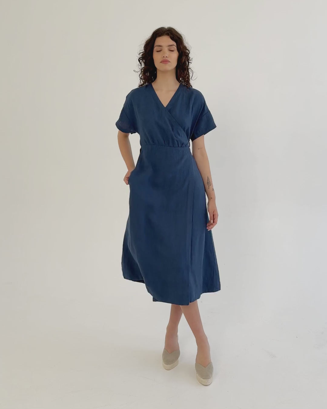 Dieses leichte und atmungsaktive Wickelkleid bietet unbeschwerten Tragekomfort. Es ist aus weichem, tiefmarineblauem Leinen gefertigt und verfügt über einen schmeichelnden V-Ausschnitt, einen verstellbaren Taillengürtel und kurze Ärmel für einen entspannten und zugleich eleganten Look. Das Kleid schmiegt sich eng an den Körper an und ermöglicht so eine individuelle Passform, die sich jeder Körperform anpasst. In Midi-Länge mit versteckten Seitentaschen eignet sich dieses vielseitige Kleidungsstück perfekt für warme Tage oder zum Überziehen bei kühlerem Wetter.