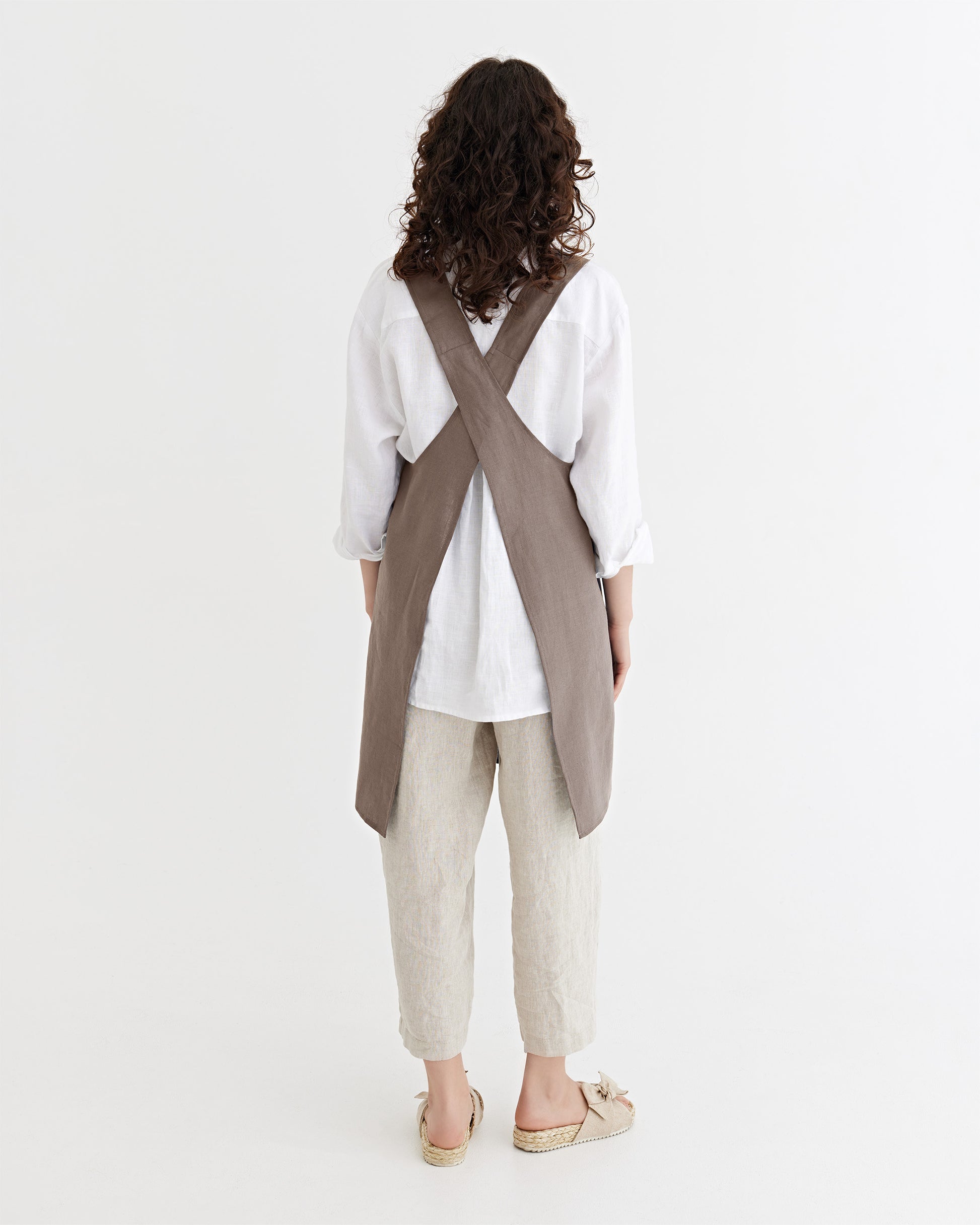 Ein Trägerkleid in verschiedenen Farben. Dieses Kleidungsstück kann sowohl als einzigartige Designschürze beim Kochen in der Küche, bei der Gartenarbeit als auch als kuscheliges Kleid an heißen Sommertagen getragen werden. Das Schürzenkleid hat keine Bänder und lässt sich daher leicht an- und ausziehen. Es ist in der Taille gerafft und verfügt über zwei Taschen an den vorderen Ecken. Dieses Kleidungsstück passt problemlos allen Körperformen und -größen.