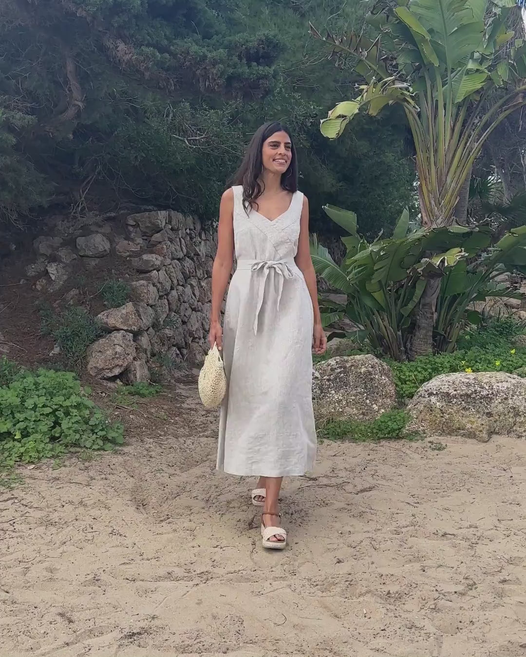 Das A-Linien-Leinenkleid CHILOE ist ein zeitloses Basic mit schmeichelndem V-Ausschnitt und fließender Midi-Silhouette. Das strukturierte Oberteil und der leicht ausgestellte Rock verleihen dem Kleid mühelose Bewegungsfreiheit und verleihen ihm eine elegante, feminine Silhouette. Die breiten Träger bieten Komfort und Halt und machen es perfekt für warme Tage.