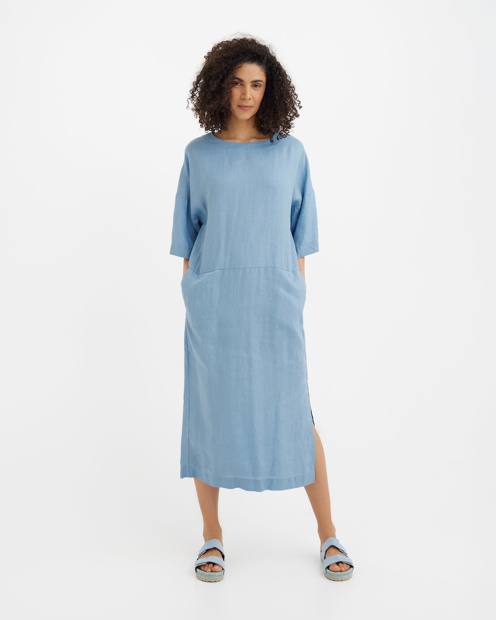 The midweight linen provides moderate everyday coverage under standard lighting.