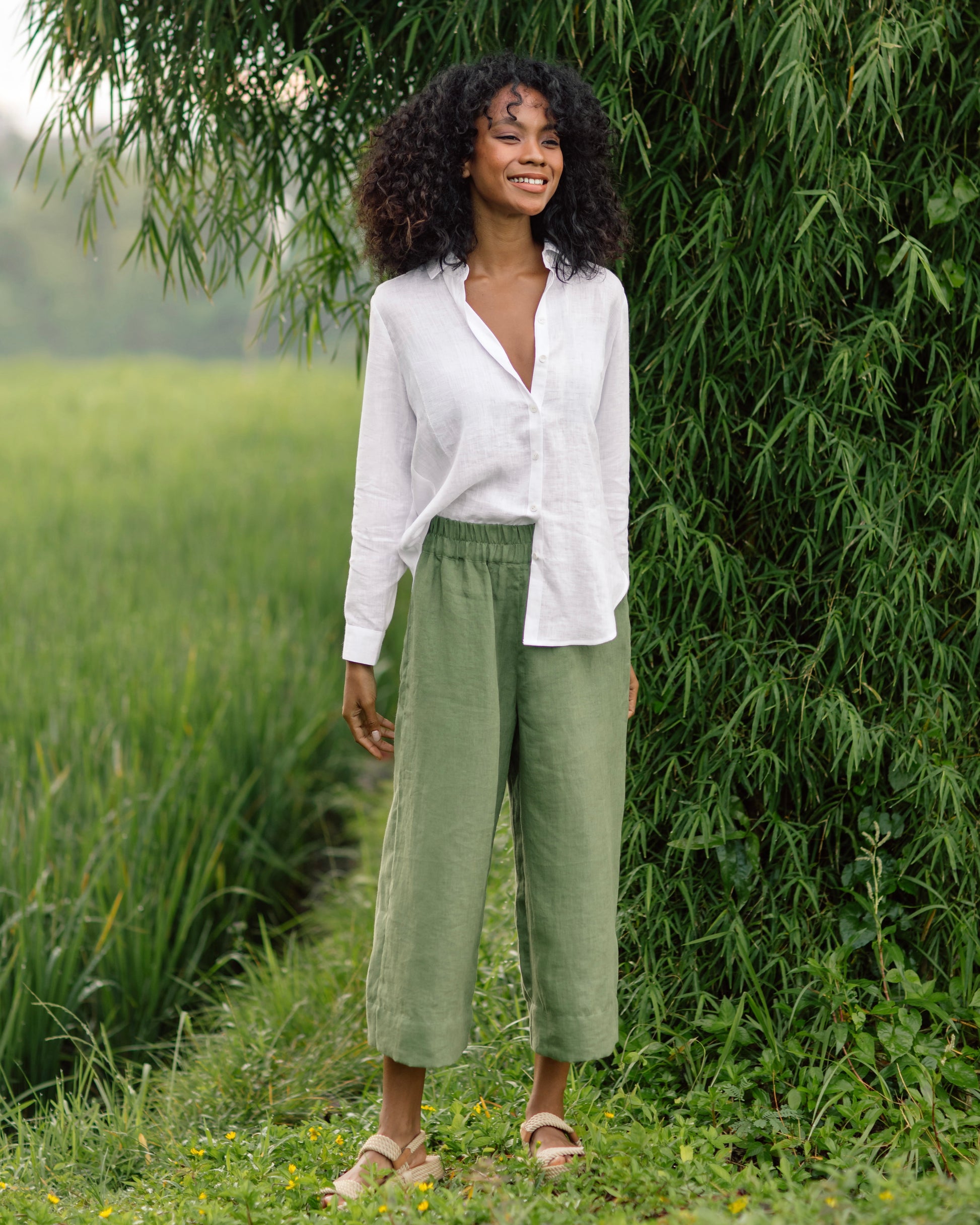 Falten sind ein natürlicher Bestandteil von Leinen, unabhängig vom Kleidungsstück. Sie sind ein Zeichen für die Qualität des Leinens: Mehr Falten bedeuten reines Leinen, weniger Falten bedeuten, dass es möglicherweise mit Baumwolle gemischt wurde. Das liegt an der geringen Elastizität der Flachsfasern, die Leinen nicht dehnbar macht und ihm gleichzeitig eine knittrige, abgenutzte Textur verleiht.