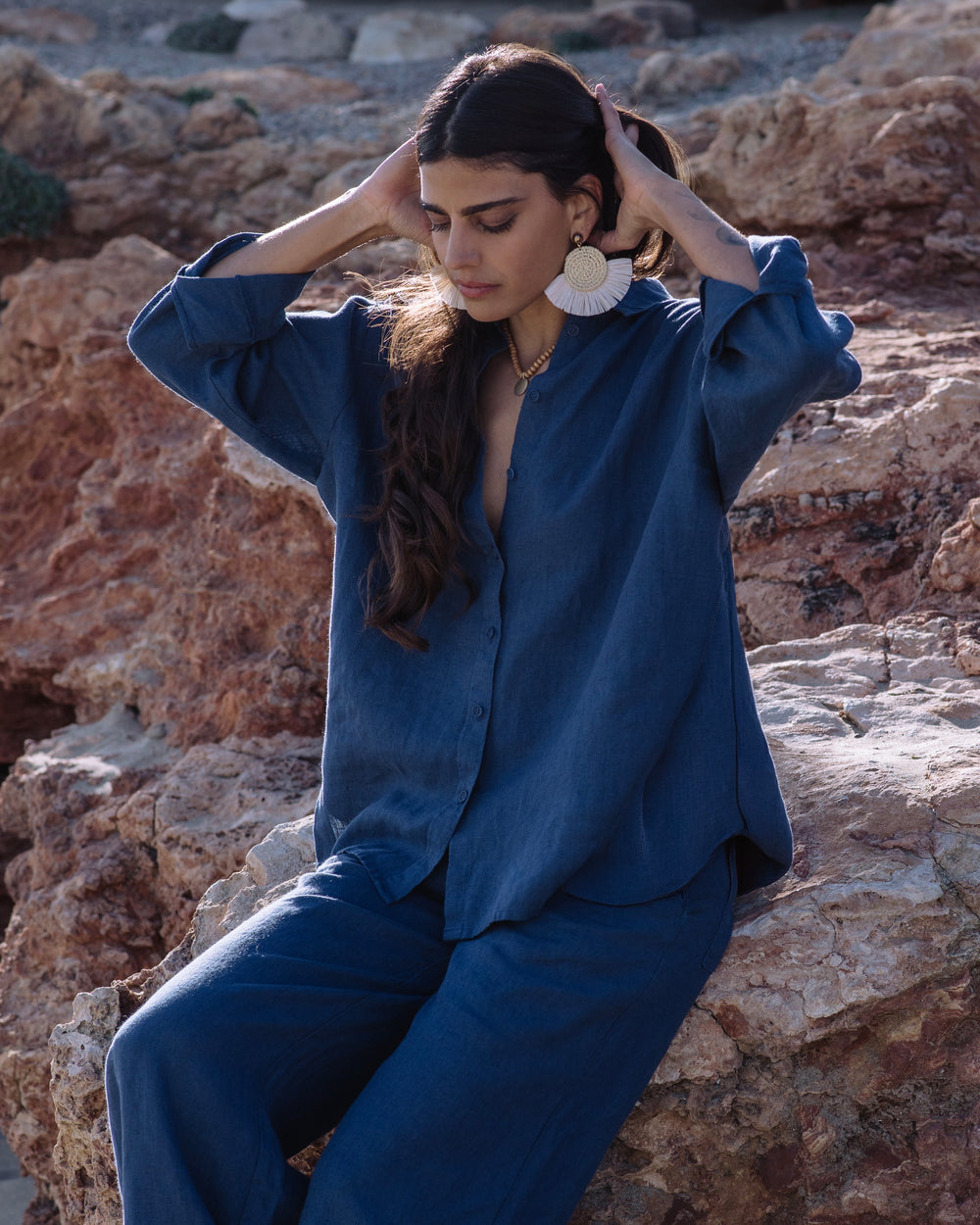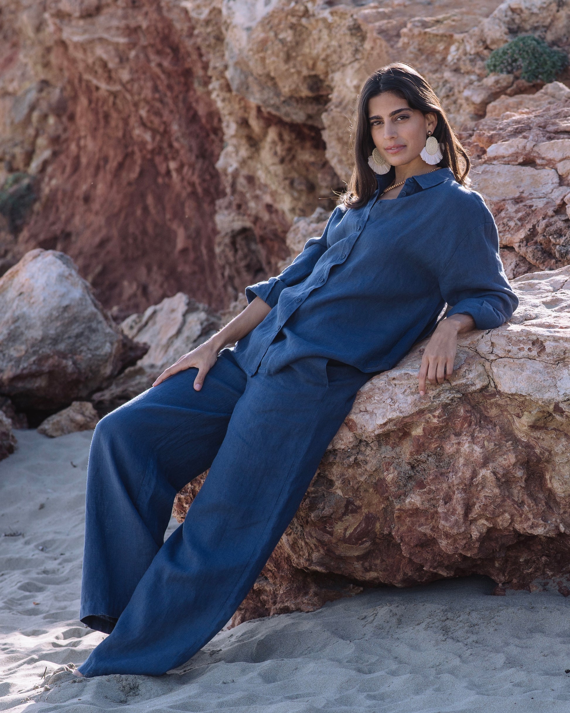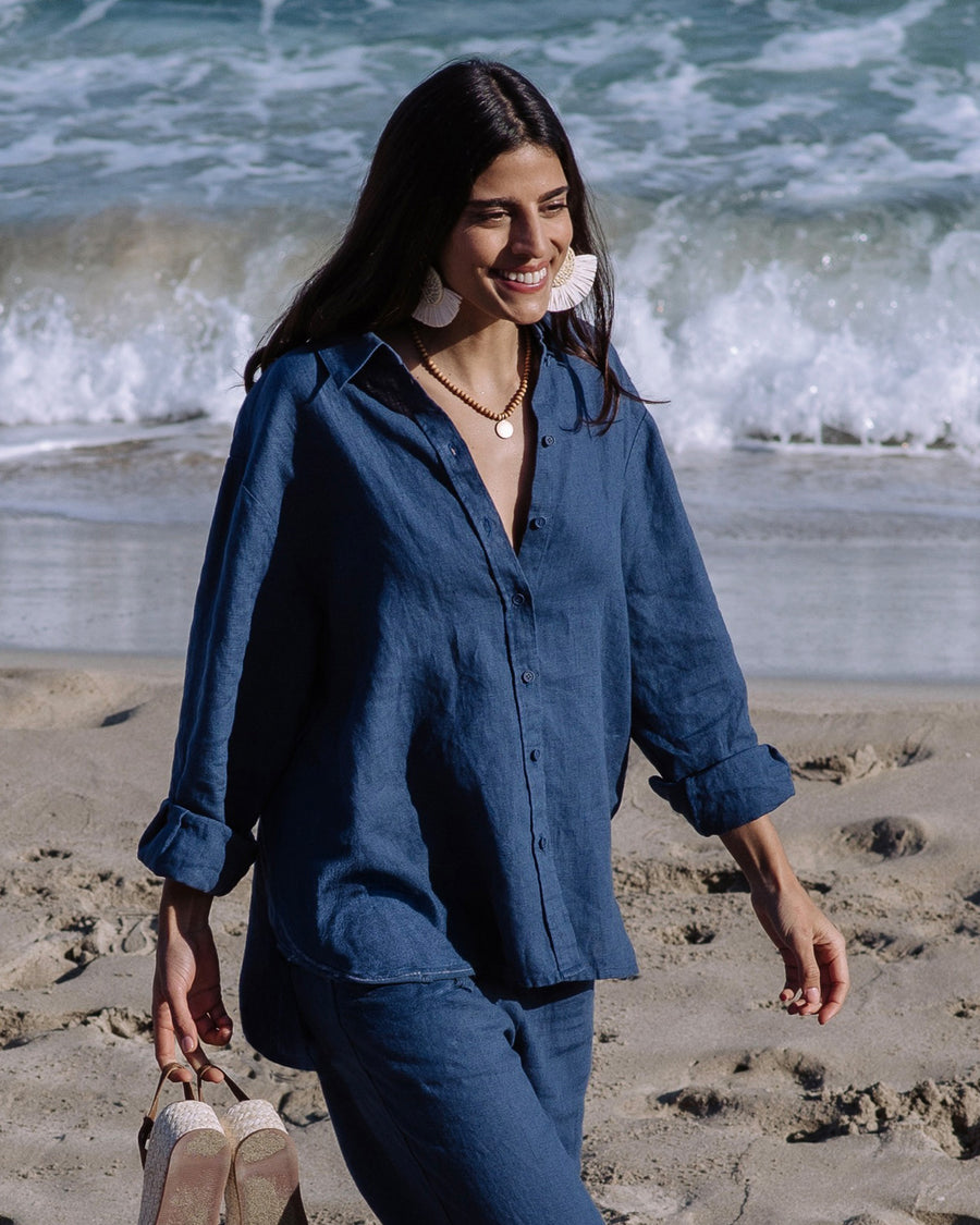 Falten sind ein natürlicher Bestandteil von Leinen, unabhängig vom Kleidungsstück. Sie sind ein Zeichen für die Qualität des Leinens: Mehr Falten bedeuten reines Leinen, weniger Falten bedeuten, dass es möglicherweise mit Baumwolle gemischt wurde. Das liegt an der geringen Elastizität der Flachsfasern, die Leinen nicht dehnbar macht und ihm gleichzeitig eine knittrige, abgenutzte Textur verleiht.