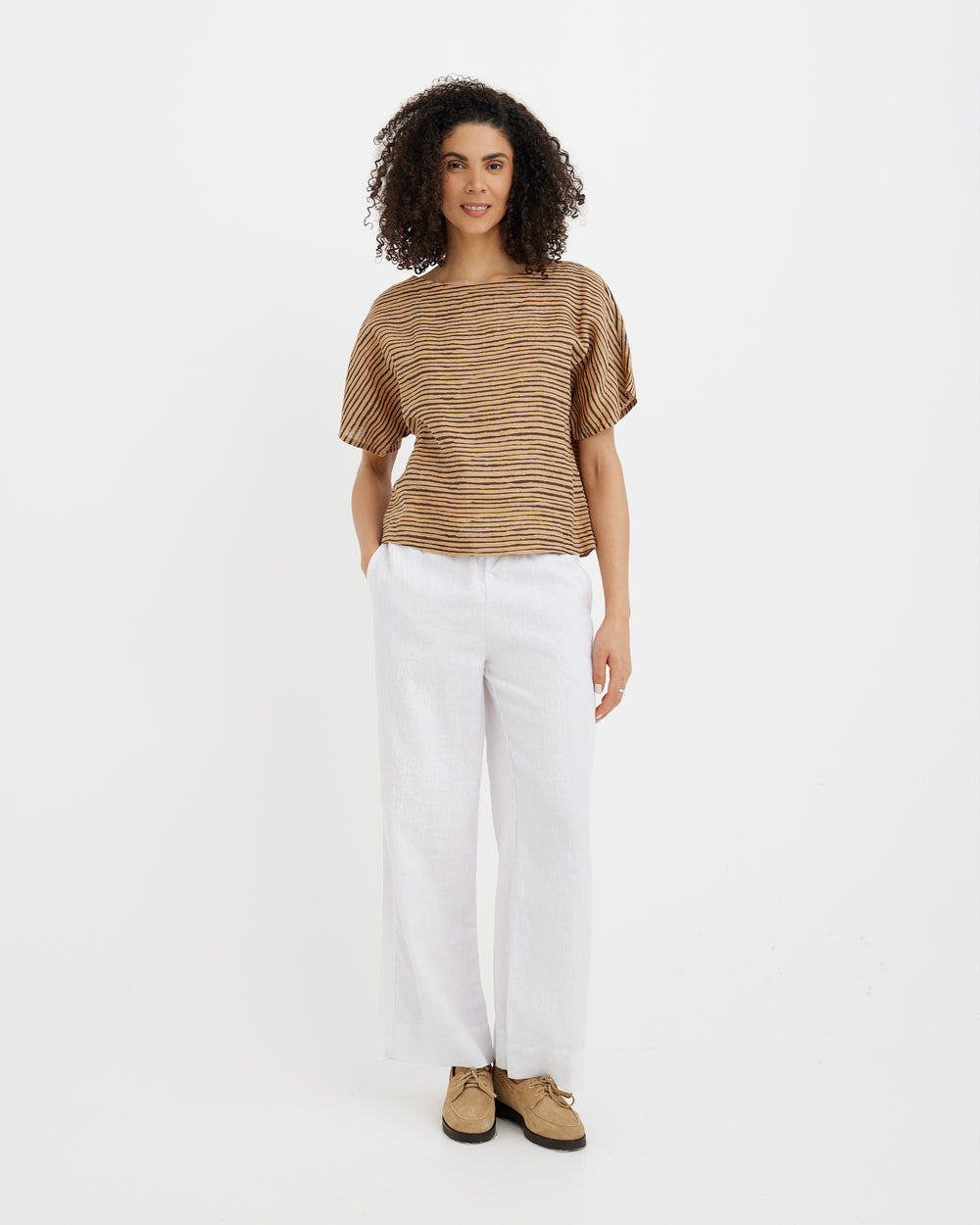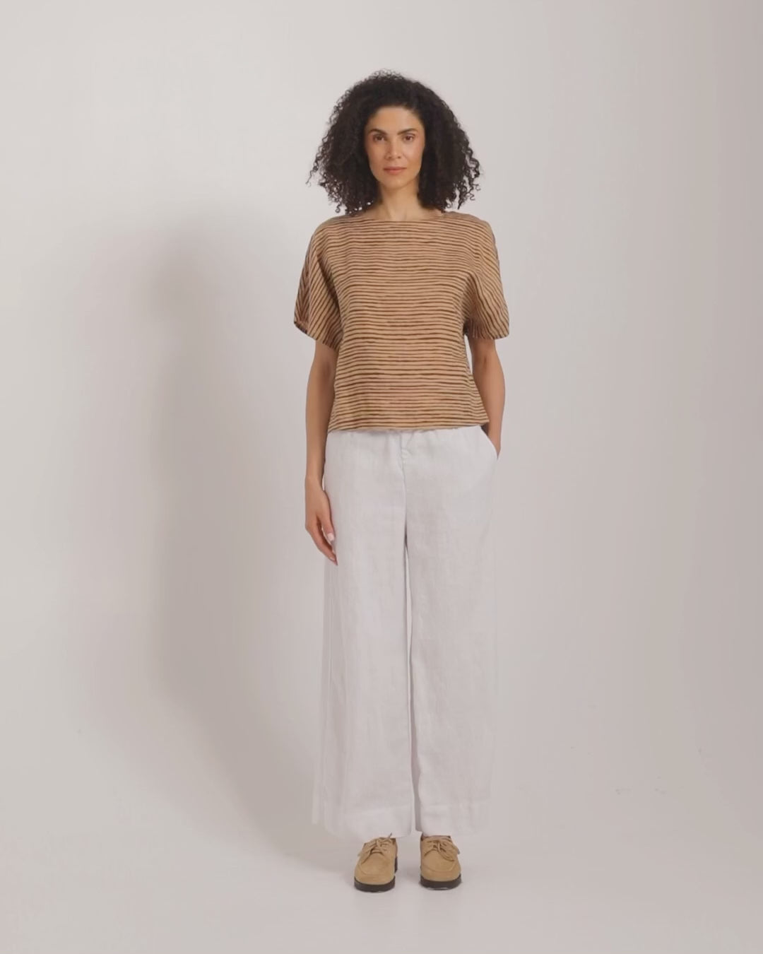 Falten sind ein natürlicher Bestandteil von Leinen, unabhängig vom Kleidungsstück. Sie sind ein Zeichen für die Qualität des Leinens: Mehr Falten bedeuten reines Leinen, weniger Falten bedeuten, dass es möglicherweise mit Baumwolle gemischt wurde. Das liegt an der geringen Elastizität der Flachsfasern, die Leinen nicht dehnbar macht und ihm gleichzeitig eine knittrige, abgenutzte Textur verleiht.