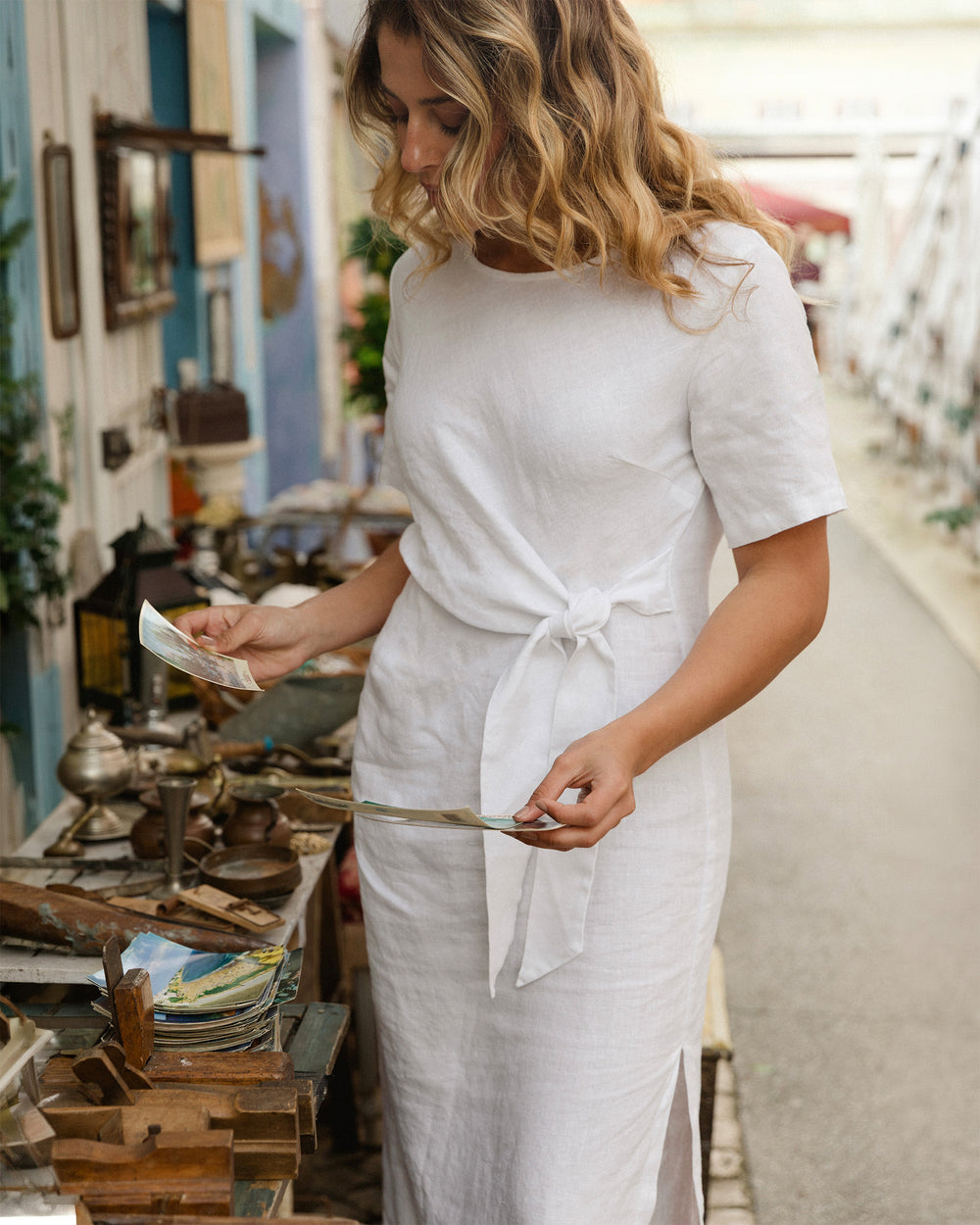 Falten sind ein natürlicher Bestandteil von Leinen, unabhängig vom Kleidungsstück. Sie sind ein Zeichen für die Qualität des Leinens: Mehr Falten bedeuten reines Leinen, weniger Falten bedeuten, dass es möglicherweise mit Baumwolle gemischt wurde. Das liegt an der geringen Elastizität der Flachsfasern, die Leinen nicht dehnbar macht und ihm gleichzeitig eine knittrige, abgenutzte Textur verleiht.
