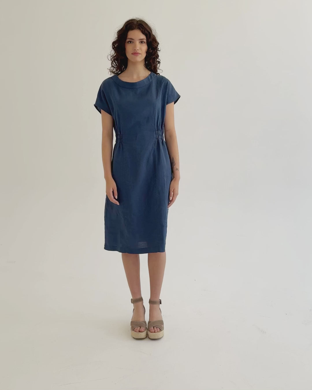 The Cap Sleeve Linen Dress SAGUARO in Deep navy blue color blends style and comfort with its soft cap sleeves, boat neckline, and subtle elastic sides for a flattering fit. Its knee-length silhouette makes it a versatile choice for casual and dressy occasions. Perfect for work, weekend outings, or travel, this timeless piece is a must-have in any wardrobe.