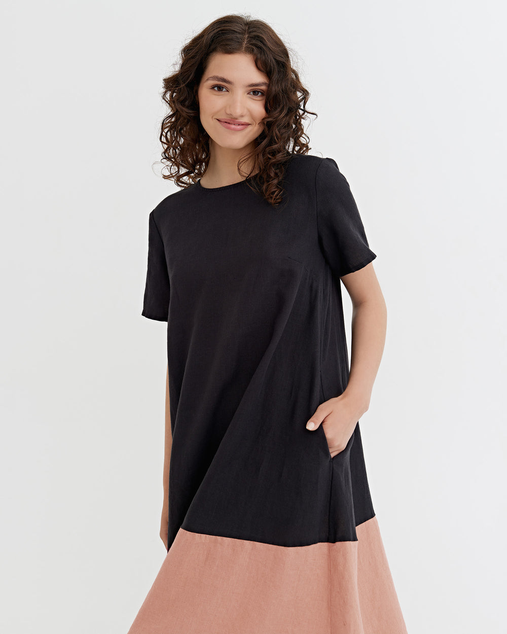 The SCILLA dress blends minimalist charm with a modern twist. Made from breathable, medium-weight linen, this A-line silhouette features a clean round neckline and short sleeves, falling into an asymmetric hemline that enhances movement. The striking black-and-ash rose color block adds a playful contrast while maintaining a refined, natural palette.