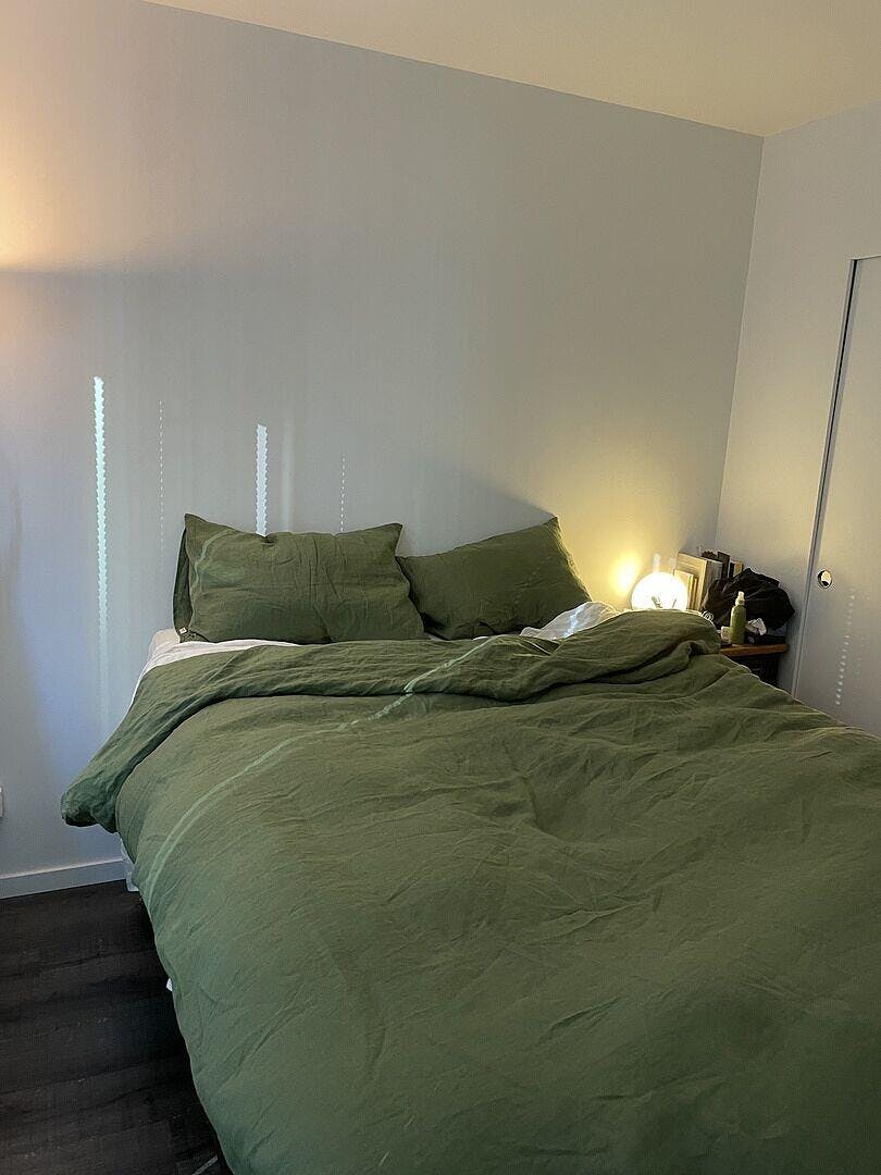 Linen duvet cover set in forest green color. Refresh the look of your bed with this linen bedding set featuring a duvet cover and two regular style pillowcases. Our linen duvets are made from wide fabric and do not feature any additional seams in the middle. You can also choose standard, queen, or king pillowcases for your bedding set.