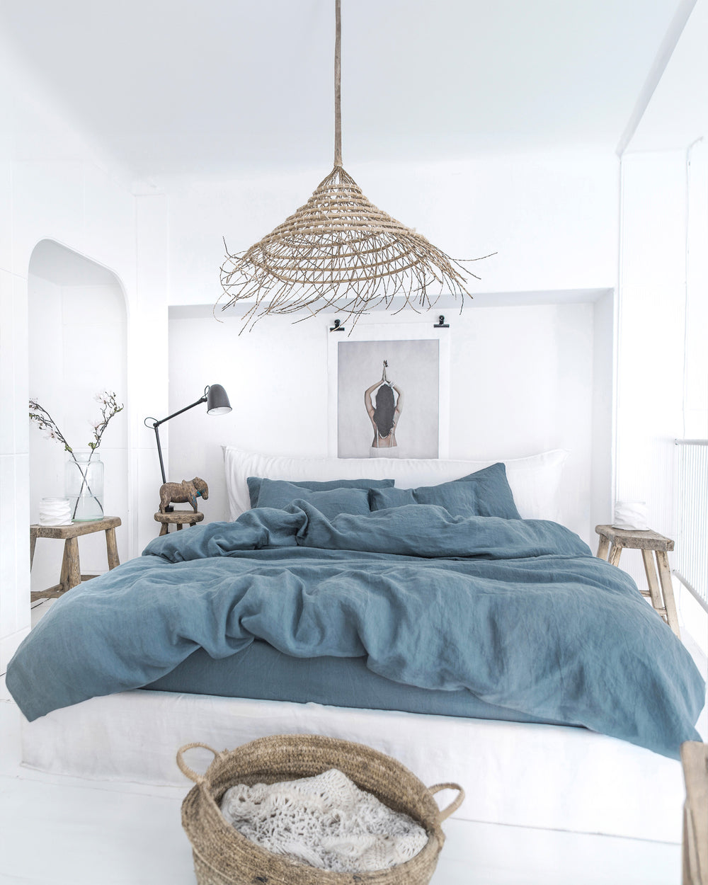 Linen duvet cover set in gray blue color. Refresh the look of your bed with this linen bedding set featuring a duvet cover and two regular style pillowcases. Our linen duvets are made from wide fabric and do not feature any additional seams in the middle. You can also choose standard, queen or king pillowcases for your bedding set.
