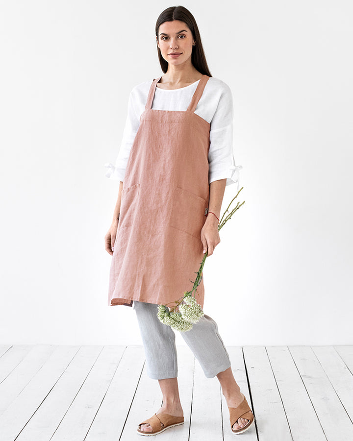 • Japanese cross-back linen apron is available in various colors. Take your cooking and gardening experiments to the next level with a stylish and functional linen apron. Durable, absorbent, and easy to care for, linen is the perfect fabric to protect your clothes from damage. Designed to have a unisex look and fit.