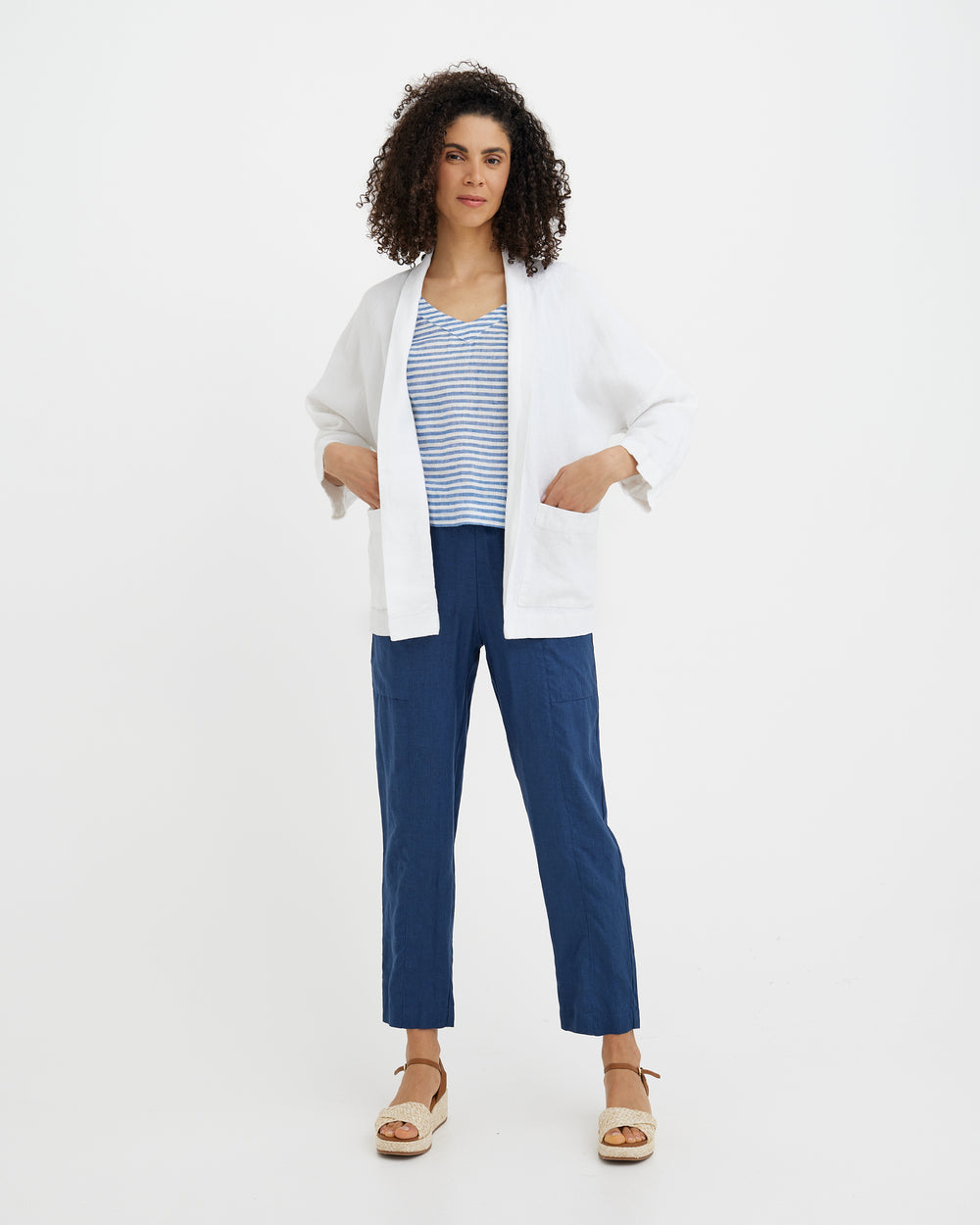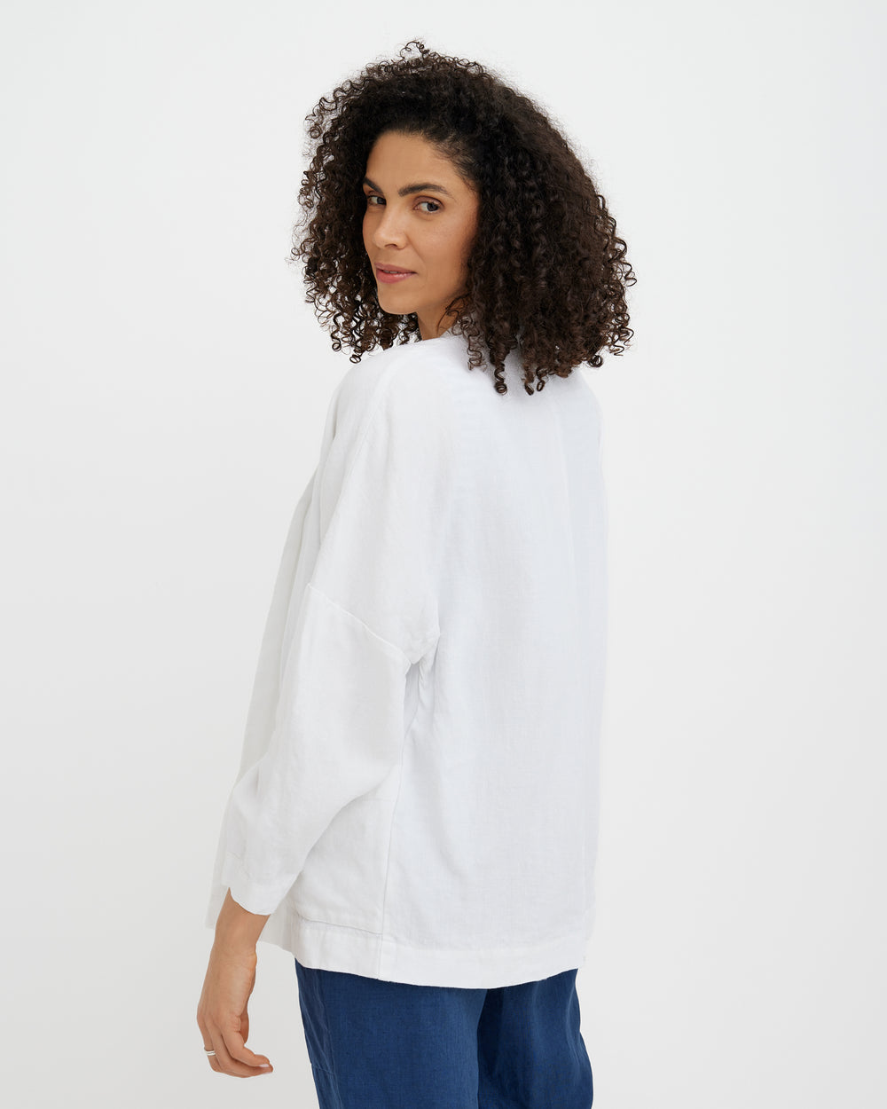 White linen jacket SAN FRANCISCO is an open-front women’s jacket made from 100% European flax linen in a heavyweight fabric. The structured silhouette features a shawl collar, long sleeves, and front patch pockets. The substantial linen construction provides breathable layering for cooler days and indoor environments.