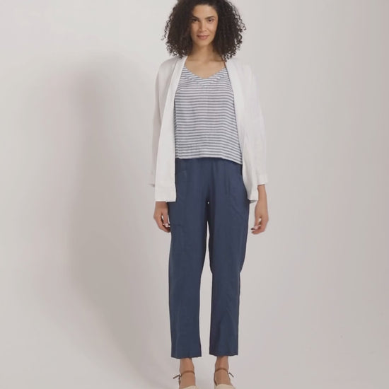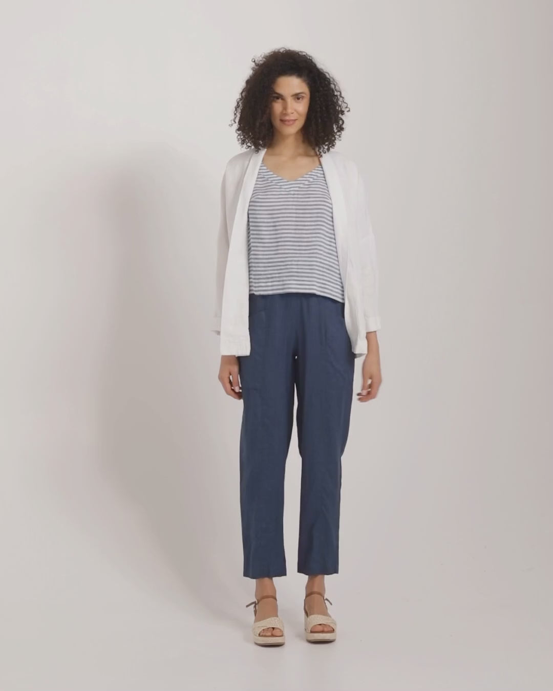 White is a bright, clean neutral that highlights the natural texture of linen. The heavyweight fabric offers solid coverage and is not sheer. It feels softened while maintaining a structured, substantial drape suited to layering.