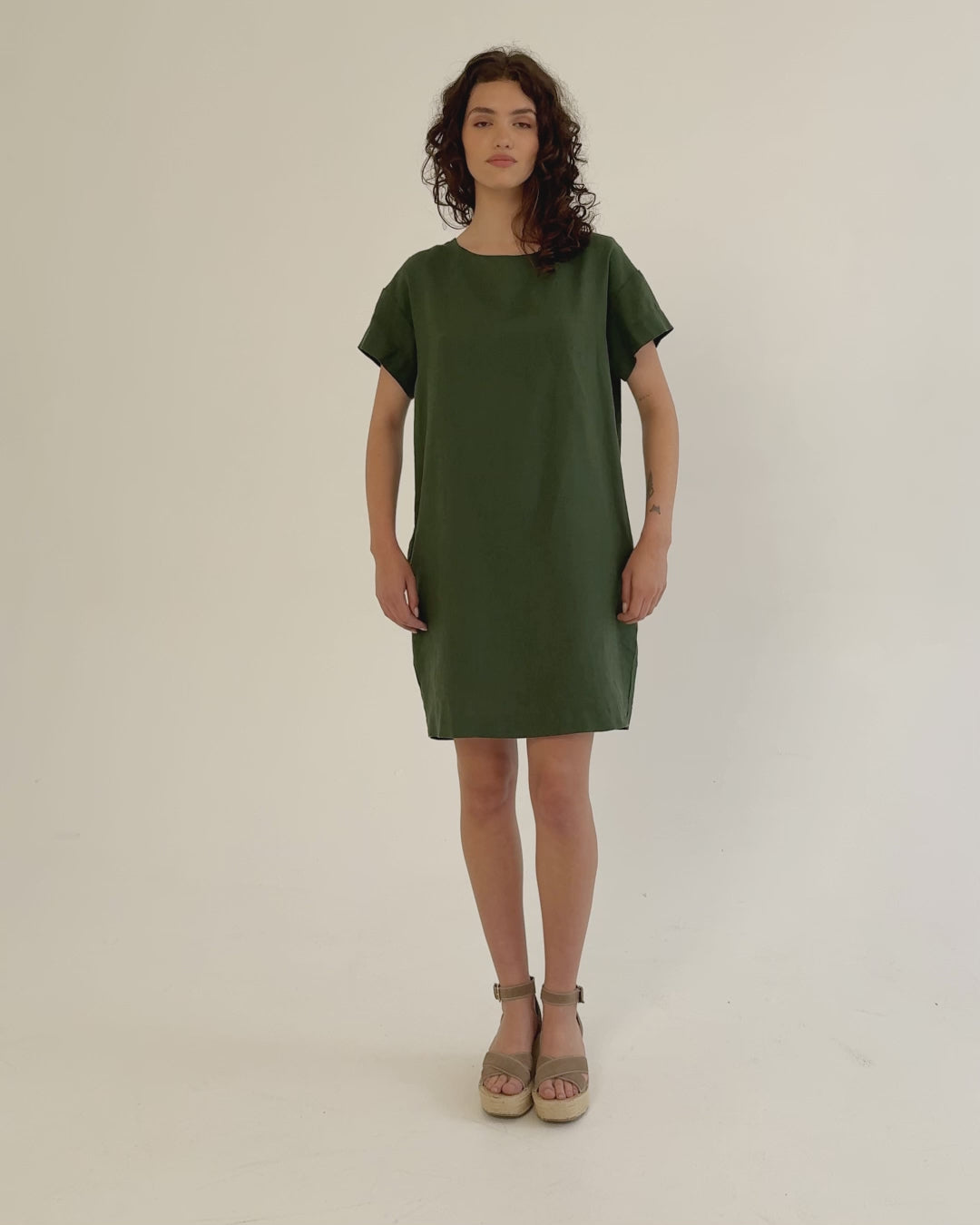 Effortlessly chic and breathable, the Linen Mini Dress SIWA in Deep green is crafted from 100% natural linen for ultimate comfort. Featuring a relaxed fit, short sleeves, and a subtle open-back detail with a button closure, it’s a perfect blend of style and ease. This dress can be worn as a mini dress or styled as a tunic paired with pants or leggings.