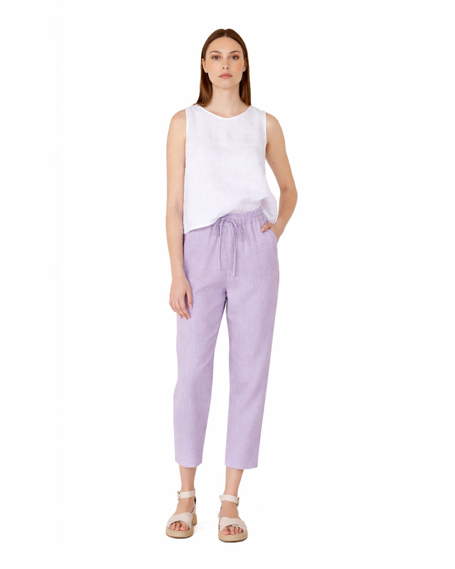 Ankle length linen pants in Lilac. Designed to have a relaxed fit, these linen trousers feature an elastic waistband and tie with a slender insert belt for maximum comfort. Whether you are having a carefree walk along the beach or going out to grab some groceries these linen pants will become your go-to during the warmer season.