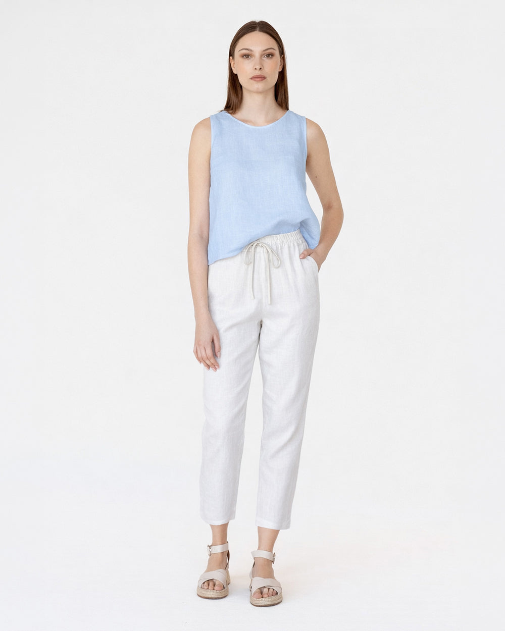 Ankle length linen pants in White. Designed to have a relaxed fit, these linen trousers feature an elastic waistband and tie with a slender insert belt for maximum comfort. Whether you are having a carefree walk along the beach or going out to grab some groceries these linen pants will become your go-to during the warmer season.