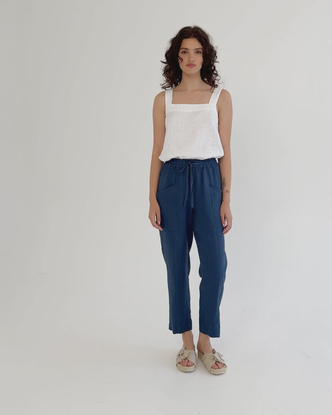 Meet the Drawstring Linen Pants SARDINIA in Deep navy blue, designed for effortless comfort and style. These relaxed-fit linen pants feature an elastic drawstring waist for an adjustable fit, while the tapered leg creates a flattering silhouette. Made from breathable, midweight linen, they keep you cool on warm days while offering year-round wearability. Functional side pockets add practicality, making them perfect for casual outings, lounging, or travel.