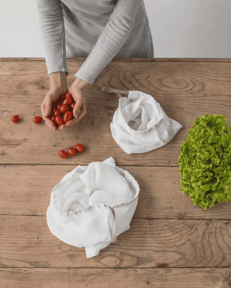 Our reusable linen produce bags feature a secure drawstring closure to ensure nothing slips out. The set includes two sizes: a larger bag ideal for items like apples, potatoes, or carrots, and a smaller bag perfect for tomatoes, green beans, and similar produce.