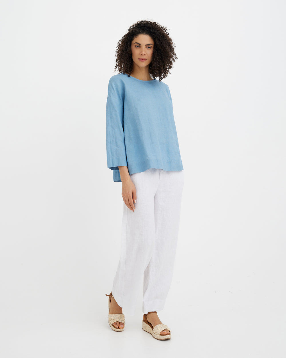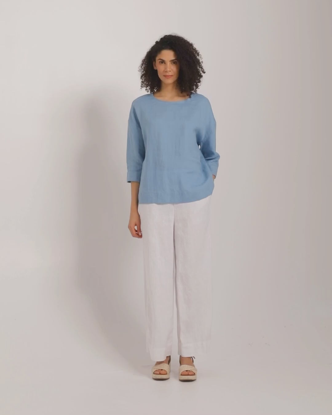 Soft Blue linen top AMSTERDAM is a relaxed A-line women’s top made from 100% European flax linen in a breathable midweight fabric (approx. 160 gsm). The silhouette widens gently toward the hem for ease of movement. A boat neckline and mid-length sleeves create a clean, structured outline with balanced everyday coverage.