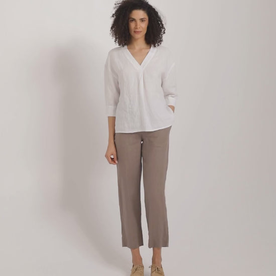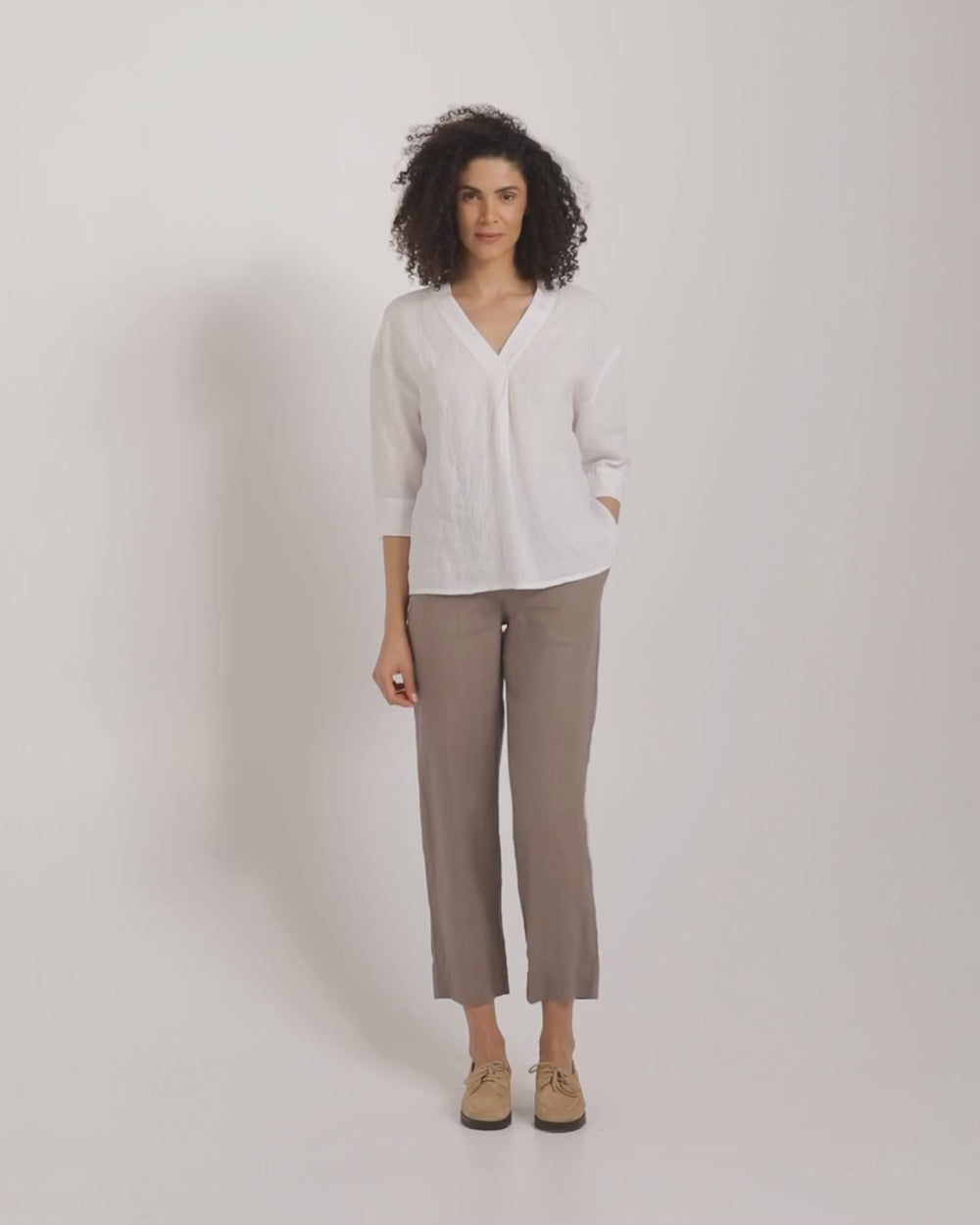 White linen top ST. TROPEZ is a relaxed A-line women’s top made from 100% European flax linen in a breathable midweight fabric (approx. 160 gsm). The silhouette offers room through the bust and waist while skimming the body without clinging. A split V-neckline and mid-length sleeves create a balanced, structured outline suited to warm-weather wear.