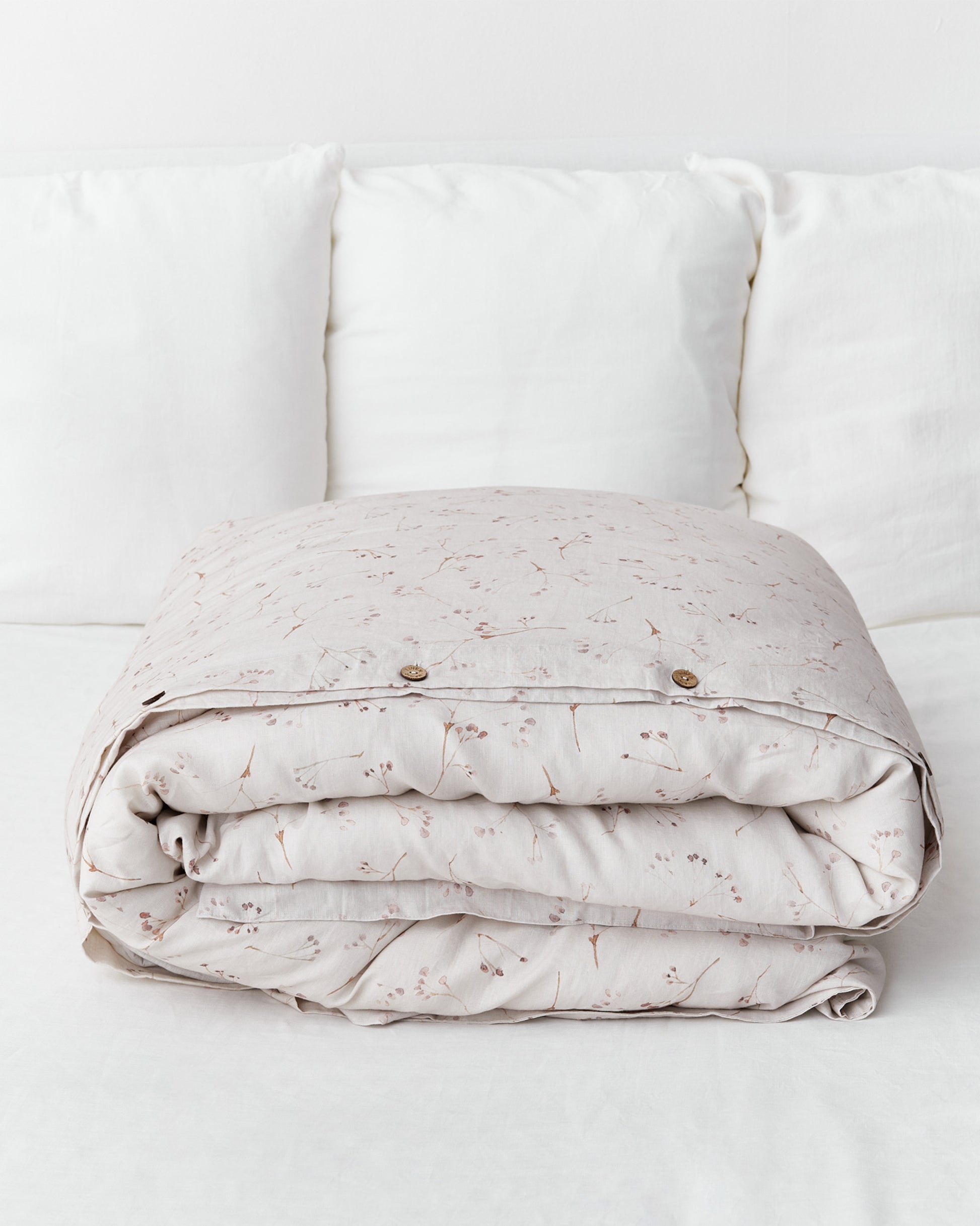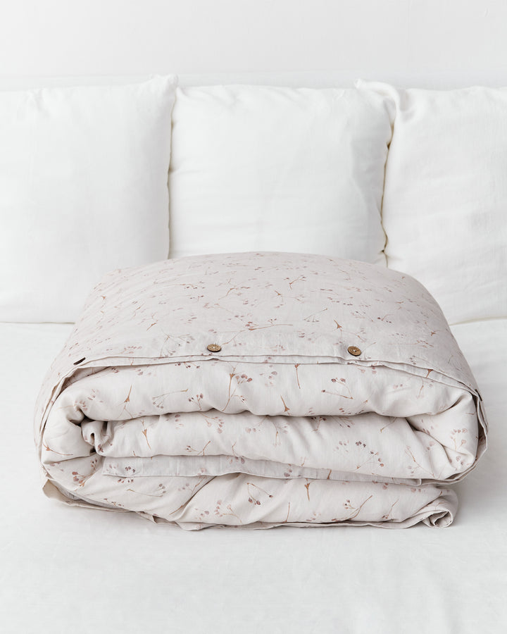 Wrap your bed in the gentle charm of our Memory Garden print linen duvet cover. Inspired by delicate dried blossoms, this design scatters soft floral sprigs across natural linen for a calming, timeless look. Crafted from 100% stonewashed linen, it feels light, breathable, and becomes softer with every wash. The hidden button closure keeps your duvet secure, while the floral print adds a subtle, romantic touch to any bedroom. Perfect for those who love natural textures and effortless style in their bedding.