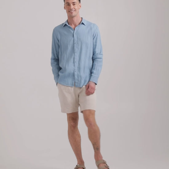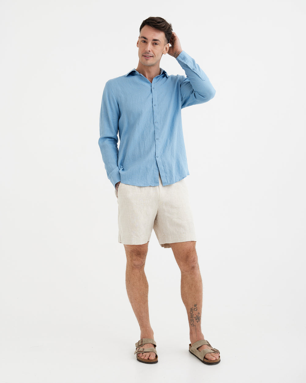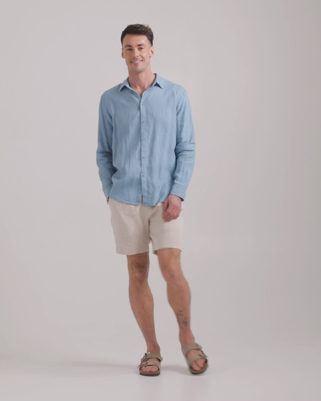 Men’s linen shirt CHICAGO in Soft Blue is made from 100% European flax linen in a breathable midweight fabric. The fitted silhouette follows the body with clean shaping through the chest and waist. The hip-length cut is designed to stay secure when tucked, and the long sleeves are proportioned to reach the wrist bone in standard sizing.