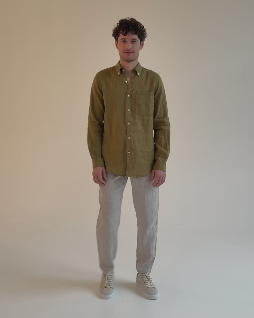 This classic men's shirt PERUGIA in Khaki green is a warm-weather essential, offering a modern fit and exceptional softness thanks to a special wash process. It features long sleeves with buttoned cuffs and a pleated back yoke for a comfortable fit. A single patch pocket on the chest adds functionality, while white river shell buttons secure the front and collar.