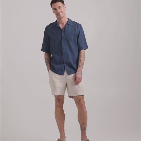Men’s short sleeve camp collar linen shirt KEY WEST in Deep Navy Blue is made from 100% European flax linen in a breathable midweight fabric. The relaxed fit allows ease through the chest and waist while maintaining balanced shoulder proportions. A notch collar and button-front closure create a clean outline suited to warm-weather wear.