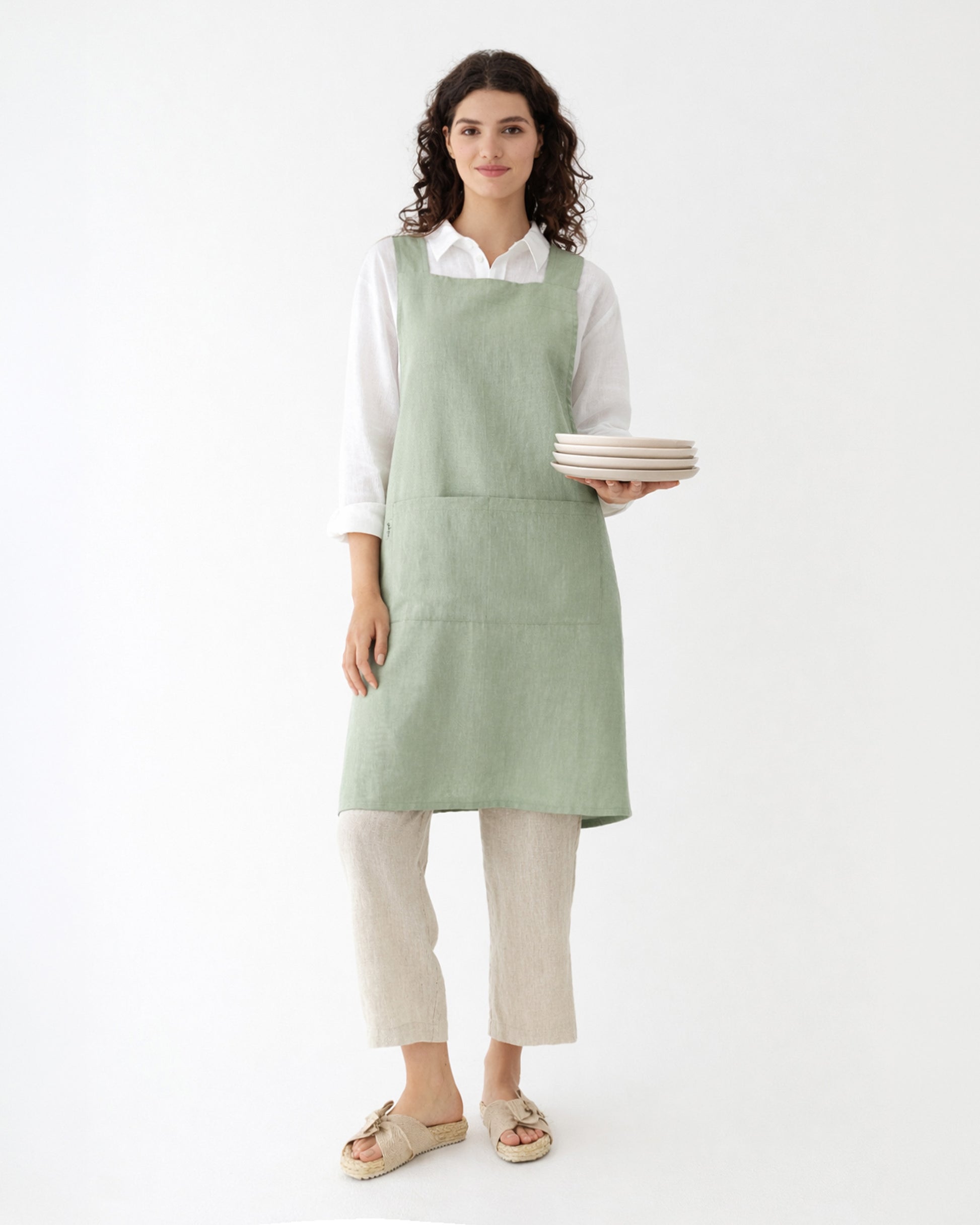 Pinafore cross-back linen apron available in various home textiles colors. Take your cooking and gardening experiments to the next level with a stylish and functional linen apron. Durable, absorbent, and easy to care for, linen is the perfect fabric to protect your clothes from damage. Designed to have a unisex look and fit.