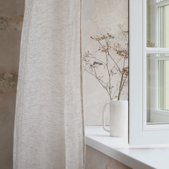 Sheer linen curtain panel in natural melange color. Soft and easy draping, this linen curtain panel is made from a lower weight fabric meaning it is sheerer in comparison to our other curtains. Can be used to cover windows and doors as a day curtain or separate large spaces from each other. Fitted with a rod pocket for easy hanging.