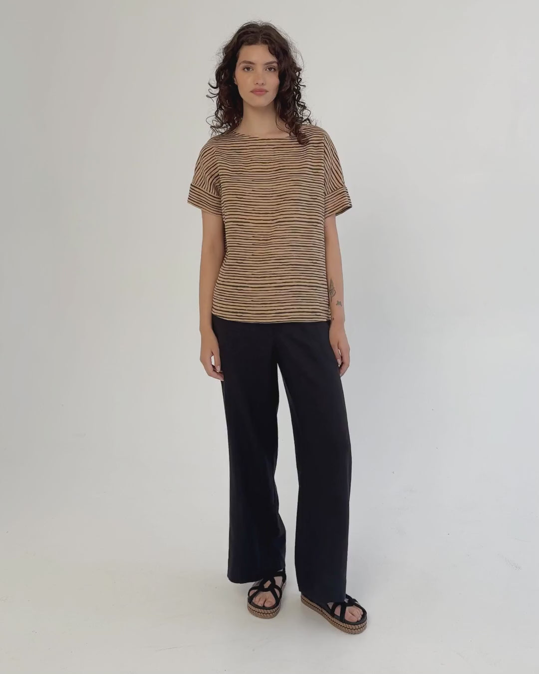 The CALABRIA top in Inked Lines brings a quiet sophistication to casual wear. Crafted from breathable, lightweight linen, this short-sleeved top features a soft boat neckline and gently rolled cuffs. Its loose, relaxed fit allows for effortless layering or standalone wear during warmer months. The ink-toned stripe pattern offers a subtle texture and depth while maintaining a minimal and clean look.