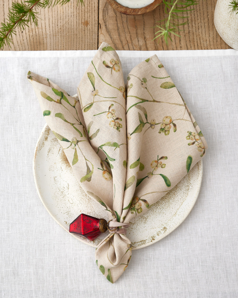 This set of two linen napkins in Under the Mistletoe print brings a seasonal detail to the table. The design shows soft green leaves and pale berries scattered across natural linen, adding a fresh winter look. Made from 100% stonewashed linen, the napkins are absorbent, long-lasting, and easy to care for. They can be folded neatly for formal settings or left casually draped for everyday meals.