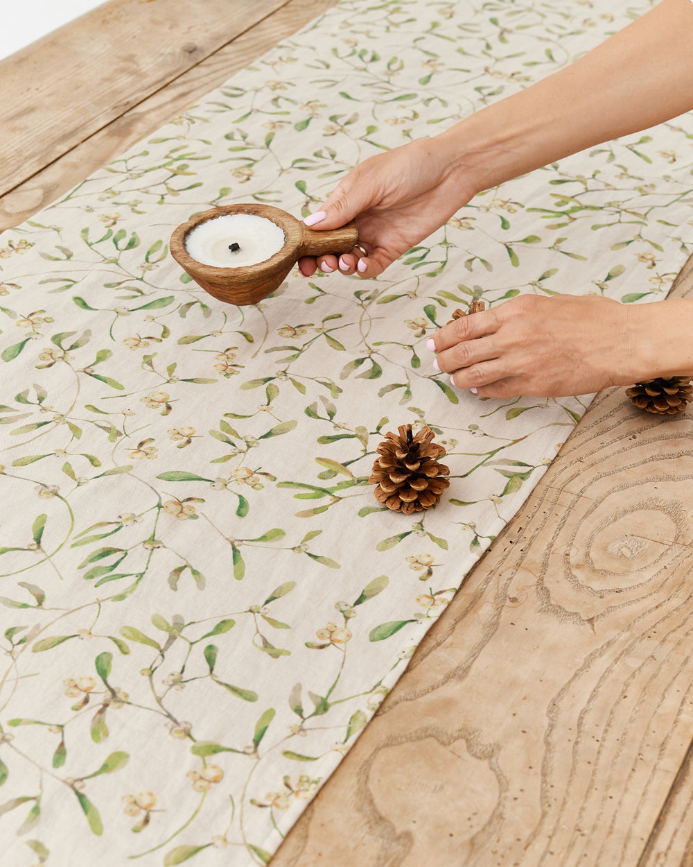 This linen table runner in Under the Mistletoe print adds a light seasonal layer to the table. The design features soft green leaves and pale berries on natural linen, giving it a calm and festive look. Made from 100% stonewashed linen, it drapes neatly across the table and works well on its own or layered over a tablecloth. A simple way to bring a touch of nature to winter meals.