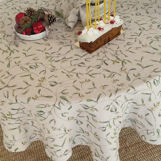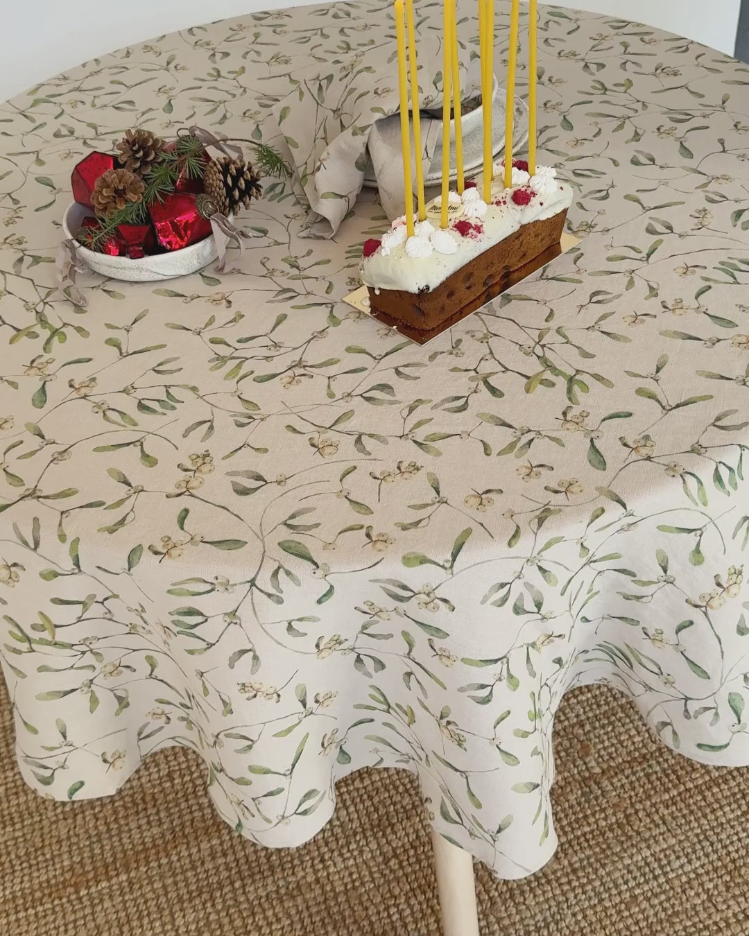 This round linen tablecloth in Under the Mistletoe print brings a soft seasonal touch to the dining table. The design shows mistletoe branches with green leaves and pale berries, adding a light winter look to mealtimes. Made from 100% stonewashed linen, it falls smoothly around the table and is strong enough for daily use as well as holiday gatherings.