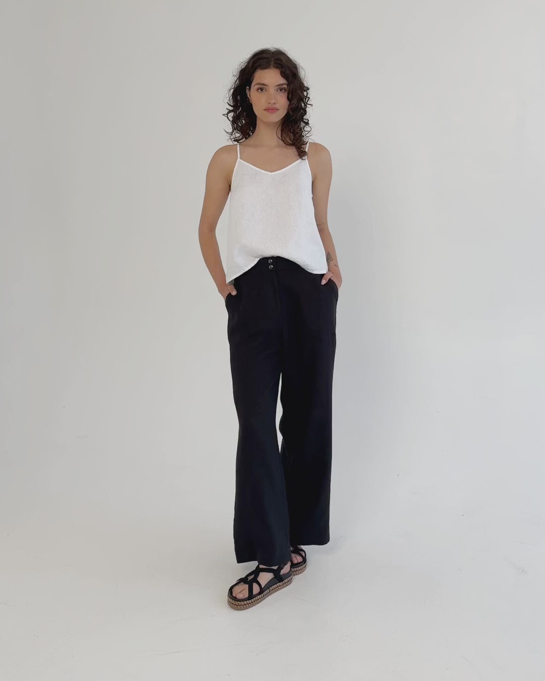 Summer classics. Wide linen pants BANFF are here to save you during hot summer days in the city. Elasticated waist, regular fit, comes in black and white – all these features are making them one of your summer clothing essentials. Add a tucked top, a loose shirt, or a sleeveless blouse and leave your house with confidence.