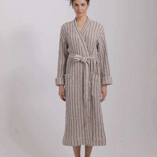 Crafted from a breathable linen and cotton waffle weave, the fabric promotes airflow while remaining soft against the skin. The natural-toned base with subtle vertical stripes creates a clean, understated look that suits any setting. A shawl collar adds structure, while the adjustable waist tie allows you to tailor the fit to your preference.