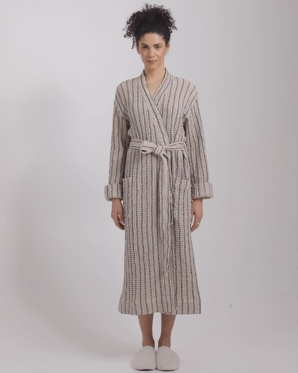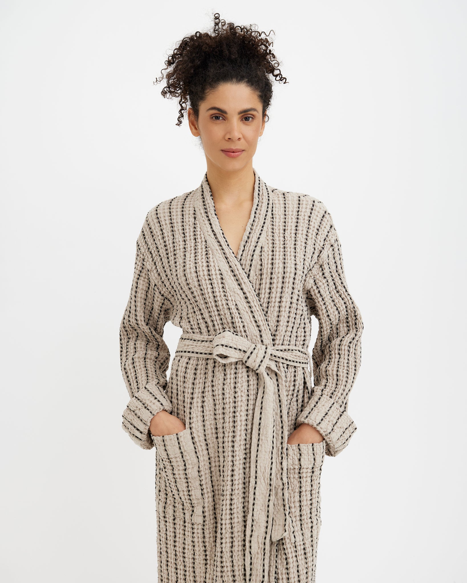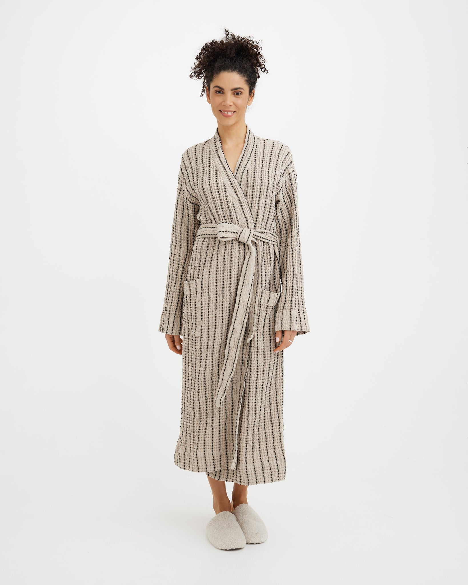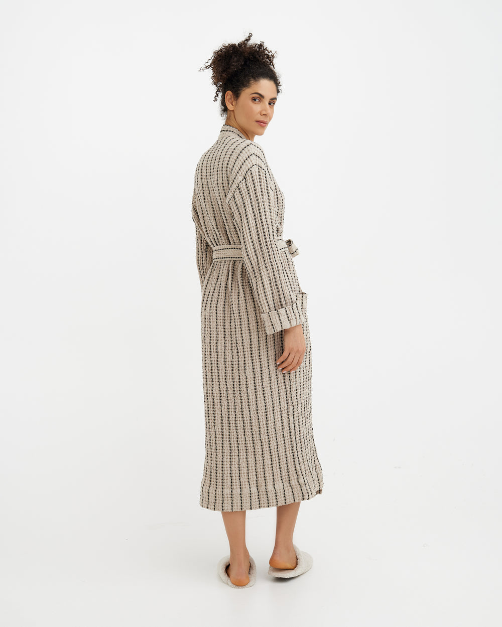 The linen and cotton blend is strong and designed for long-term use. The robe gains softness and texture over time without losing shape.
